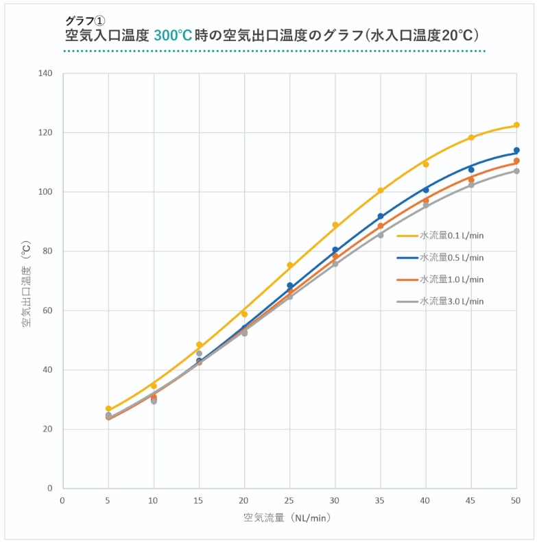 공기 입구 온도 300℃(물 입구온도 20℃)에서 공기 출구 온도 그래프 |